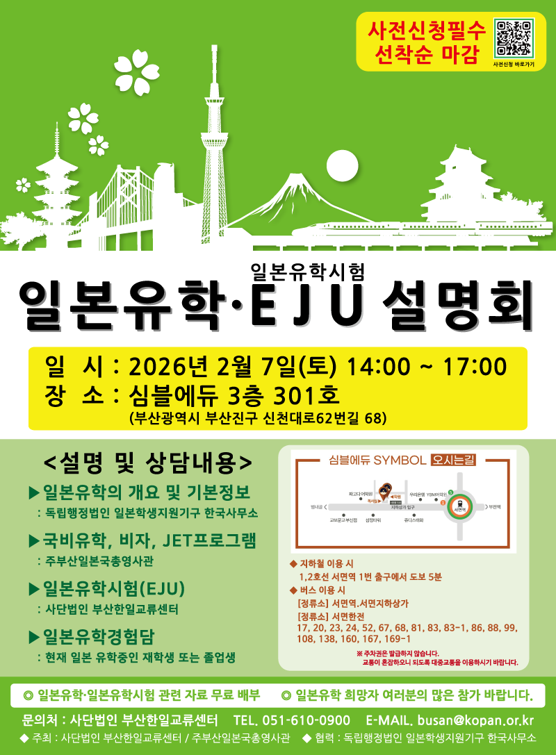 일본유학시험(EJU) 한국 실시기관 (사) 부산한일교류센터에서는 주부산일본국총영사관과 공동주최로 일본유학에 관한 설명회를 실시합니다. 오프라인으로 실시될 예정이며, 일본유학 희망자 및 학부모, 관계자 여러분들의 많은 참여 부탁드립니다. ★ 일시 : 2026년 2월 7일(토) 14:00 – 17:00 ★ 장소 : 심블에듀 3층 301호 (부산 부산진구 신천대로62번길 68) ★ 대상 : 일본유학에 관심 있는 모든 분 ★ 사전신청 : https://forms.gle/syyg1Tx6mLAHRuTa9 주최 : (사)부산한일교류센터 / 주부산일본국총영사관 협력 : 독립행정법인 일본학생지원기구 한국사무소